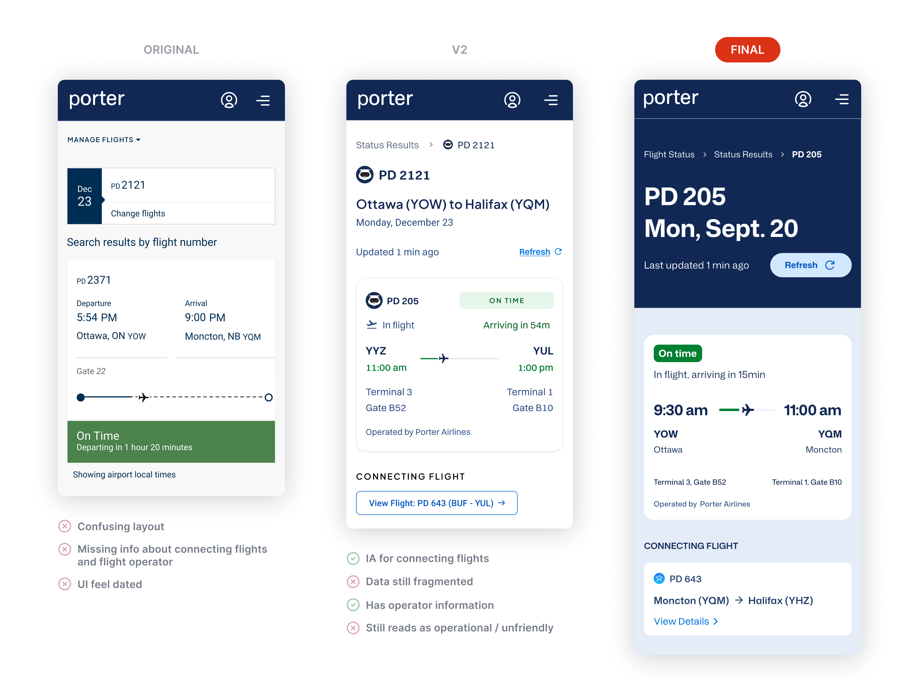 Throughout the project, requirements changed and new constraints were uncovered. Victoria and I learned that our backend could not reliably tell whether a traveller would continue on a connecting flight or end their trip at a layover, since through-flights can share the same aircraft and route. For example, a flight from Ottawa to Halifax might stop in Moncton, but not every passenger would continue past that point. Because of this limitation, we needed to design a seamless way to show the next leg of the journey, whether or not the traveller was actually taking it, so I decided to include it beneath the main flight search.