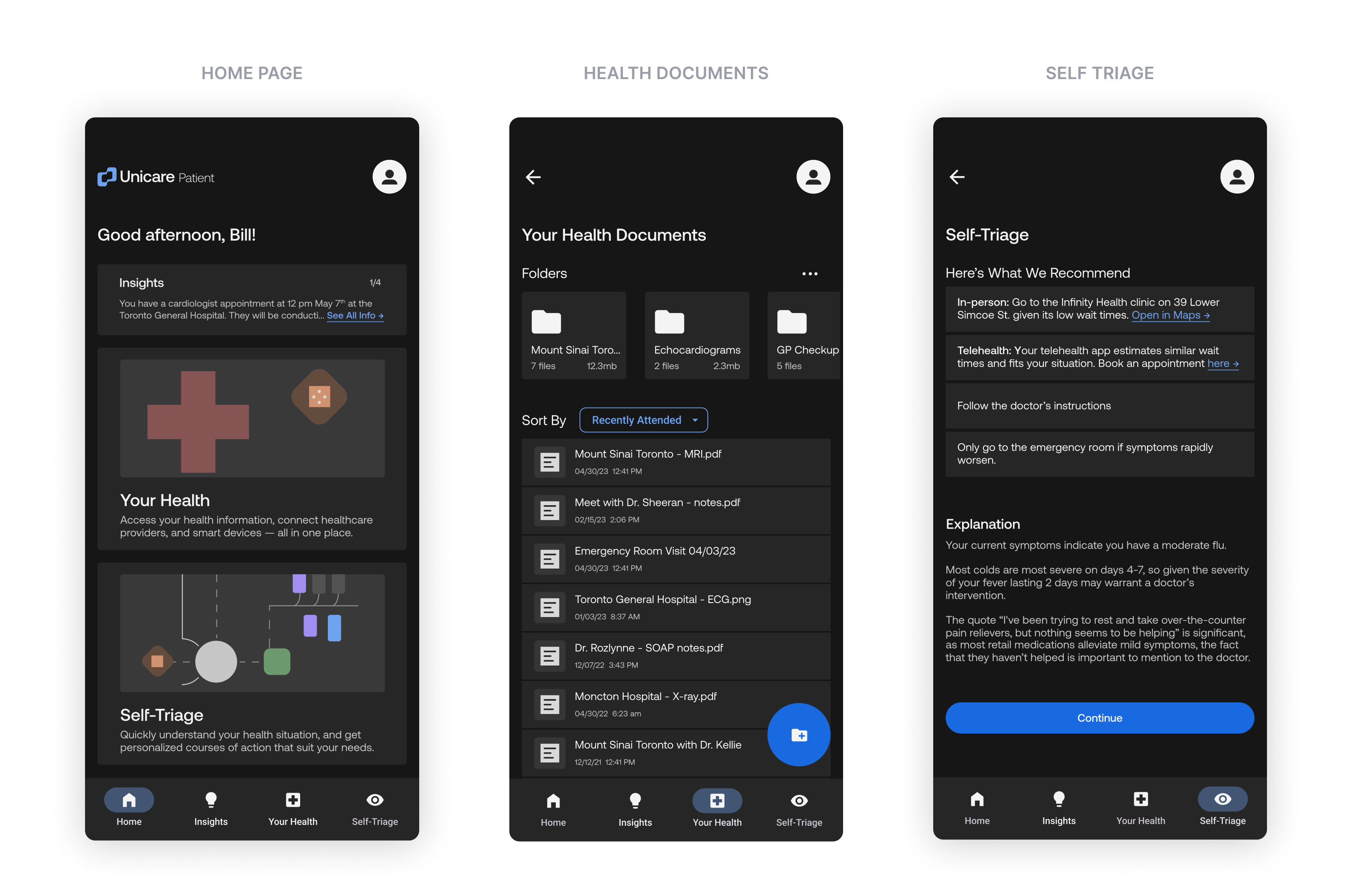 Research showed patients treating ERs as a "one-stop shop" — not by choice, but because nothing else gave them clarity. I designed the patient portal as a health home: records, connected devices, appointment insights, and most critically, a self-triage flow that walks users through symptoms, asks targeted questions, then recommends a course of action — clinic, telehealth, or ER.