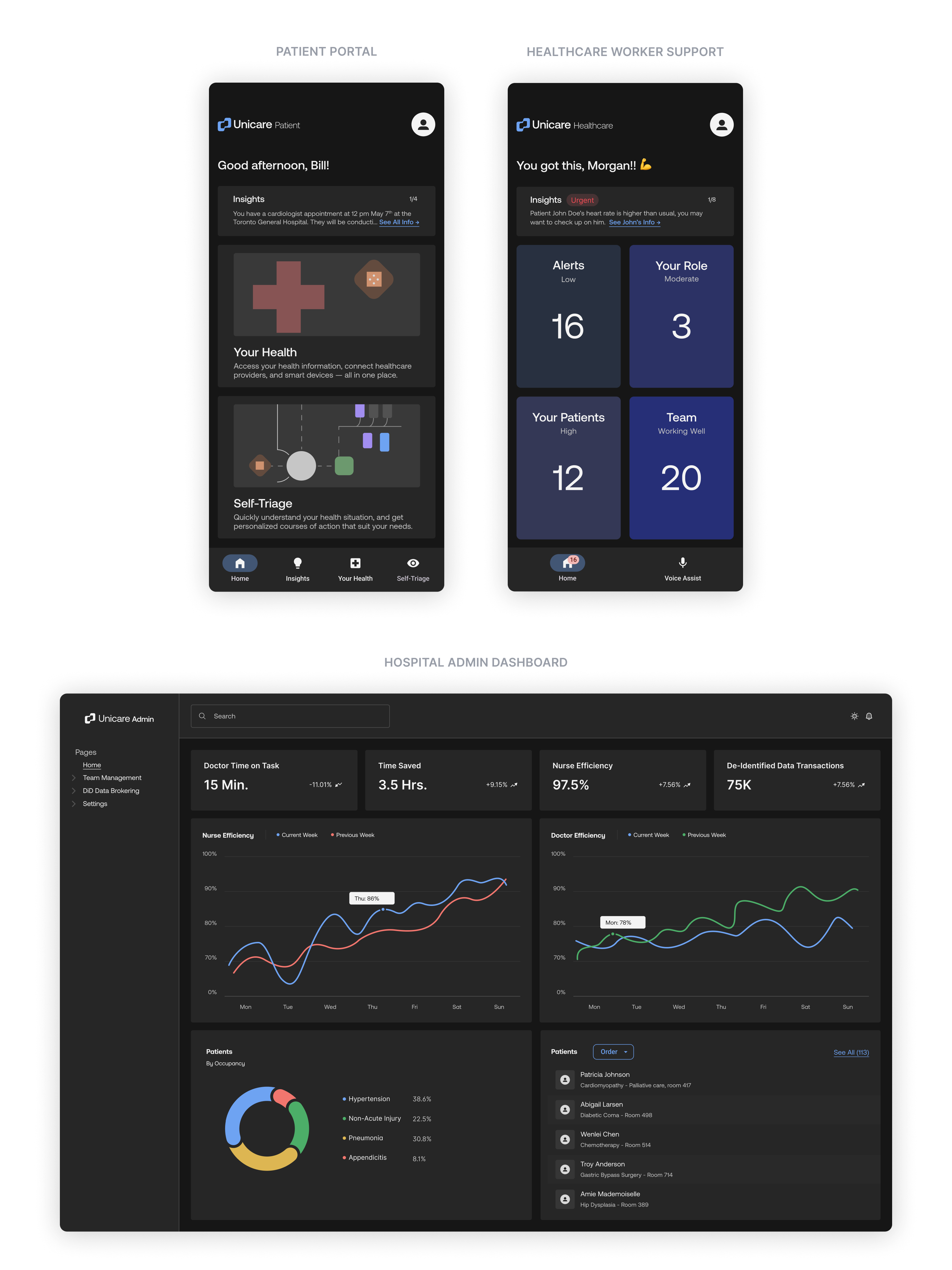 Instead of a single tool for a single user, I designed an interconnected platform. A patient portal, a bedside decision-support app, and a management dashboard, all pulling from the same data backbone. Improvement in one creates relief across all three.